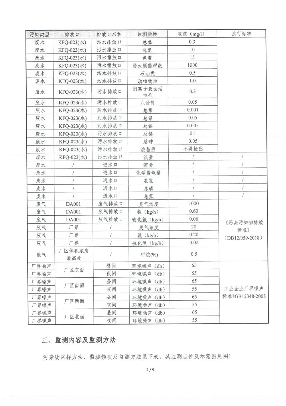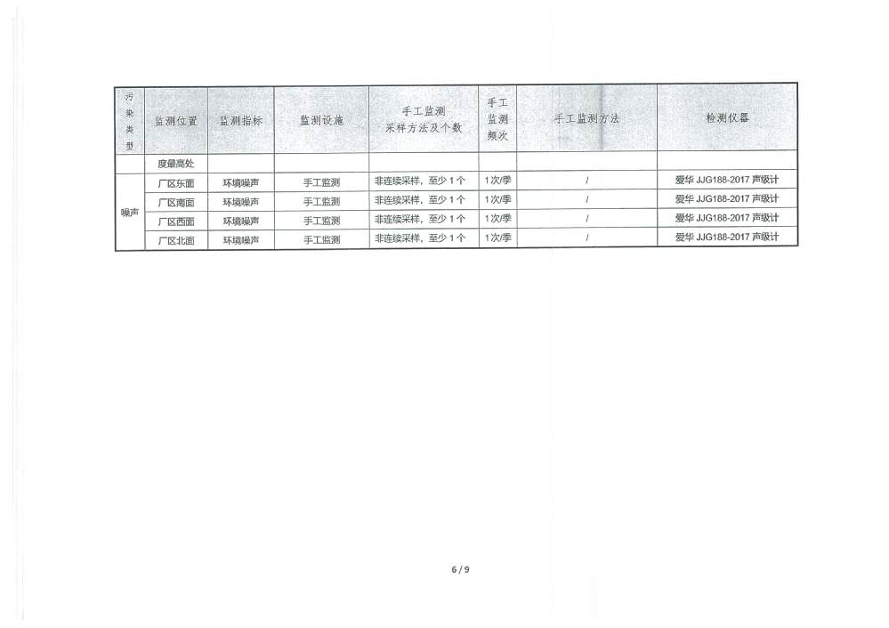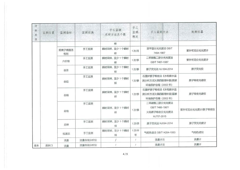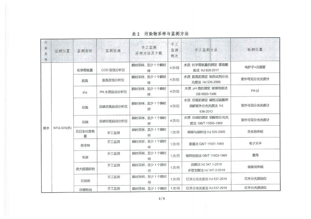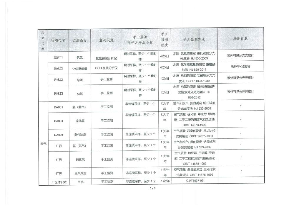 PH 6.54 6-9 92 100 COD 19.27 30 92 100 BOD5 2.31 6 92 100 SS 2.57 5 92 100 TP 0.15 0.3 92 100 TN 5.99 10 92 100 NH4-N 0.41 1.5(3.0) 92 100 色度 2.00 15 92 100 糞大腸菌群 51.87 1000 92 100 石油類 0.03 0.5 3 100 動植物油 0.05 1.0 3 100 陰離子表面活性劑 0.160 0.3 3 100 六價鉻 0.002 0.05 1 100 總鉻 0.015 0.1 1 100 總鎘 0.00014 0.005 1 100 總砷 0.0008 0.05 1 100 總鉛 0.0004 0.05 1 100 總汞 0.00037 0.001 1 100 出水達標率100% 2025年4季度 排放量(噸) 1 化學需氧量 2 氨氮(NH3-N) 3.12 3 總氮(以N計) 45.55 4 總磷(以P計) 1.14 3.防治污染設施的建設和運行情況